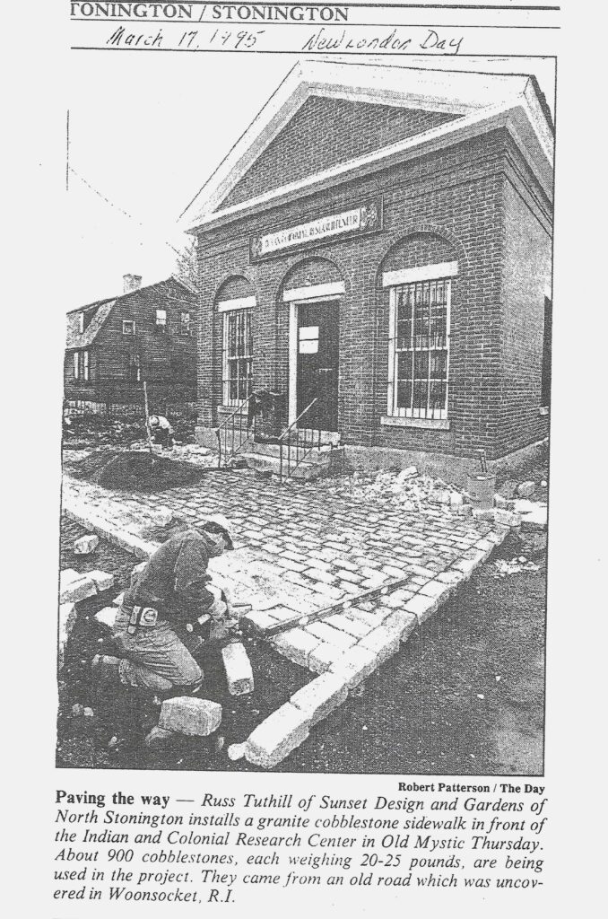 Layout of memorial cobblestones in front of the Old Mystic History Center building. Originally displayed outside in a glass case, the name lists now are located inside.